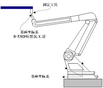 把固定工具的设置位置登录为基础坐标系的基准为止。一般如下图所示,可对准固定工具和机器人工具的TCP以确认固定工具的位置。从0~3,可登录4个固定工具。