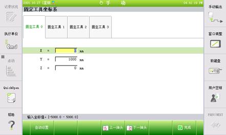 选择『[F2]: 系统』 → 『2: 控制参数』 → 『7: 坐标系记录』→ 『2:固定工具坐标系』。按自动设置(F1)即输入当前的TCP值。如需保存设定的值按完成(F7)键退出。
